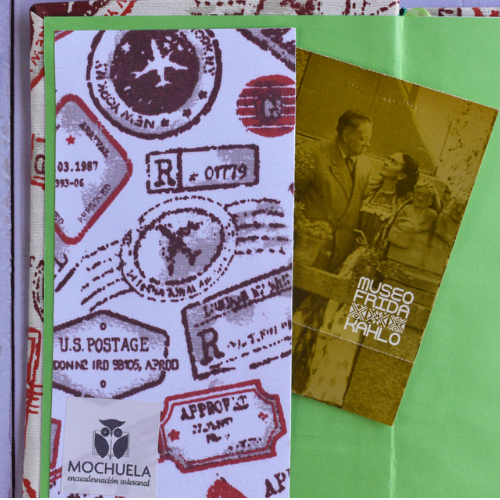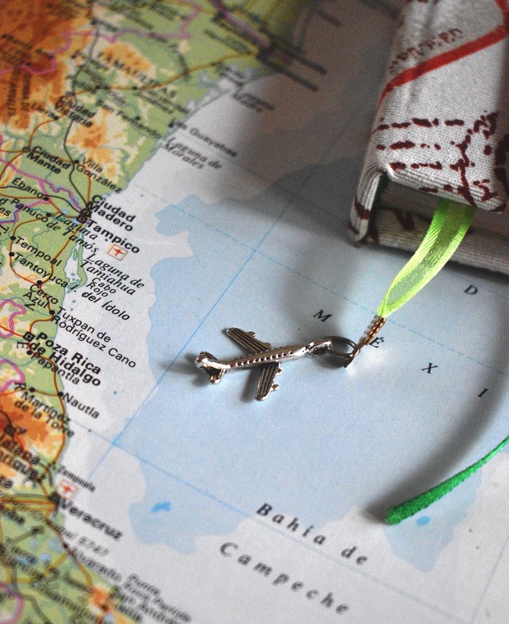 Cinta marca página con detalle de avión y elástico de cierre. Sobres y lápiz plantable.